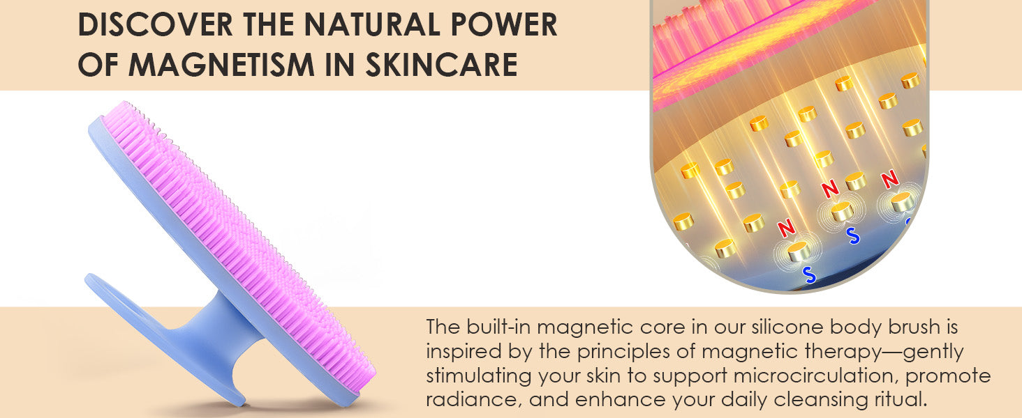 • Magnetic Therapy for Skin Health – Magnetotherapy has been studied for its potential to improve blood microcirculation and cellular activity. By integrating magnetic elements into a daily-use body cleansing tool, this brush provides subtle, non-invasive stimulation that complements your skin’s natural renewal cycle.