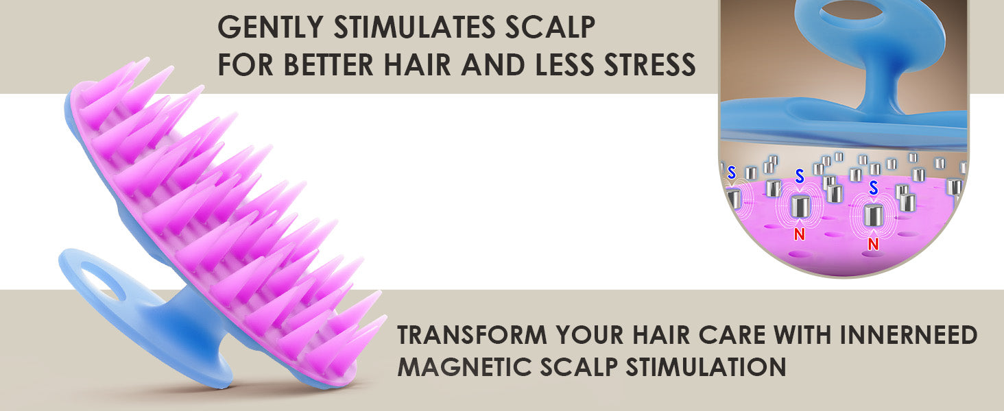 - Magnetic Stimulation for Scalp Vitality – Unlike regular scalp brushes, INNERNEED Scalp Brush features magnets embedded in the bristles that generate a weak magnetic field during each wash or massage. This added stimulation helps boost blood circulation, relieve tension, activate hair follicles, and improve nutrient delivery to the scalp—making it an ideal choice for promoting healthier hair growth and overall scalp wellness.
