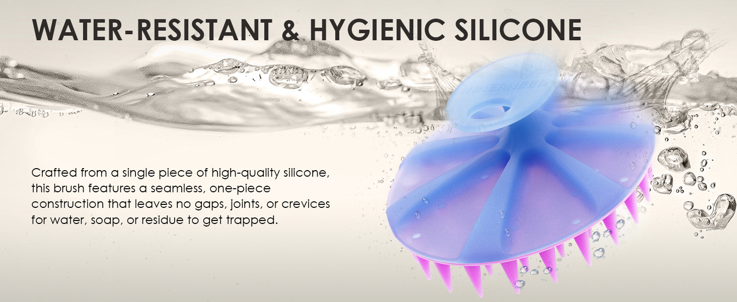 - All-Silicone One-Piece Design – Made entirely of soft yet sturdy silicone, this scalp massage shampoo brush is safe, hygienic, and easy to clean. It contains no metal or plastic parts—durable, waterproof, and mil-dew-resistant for daily shower or dry use.